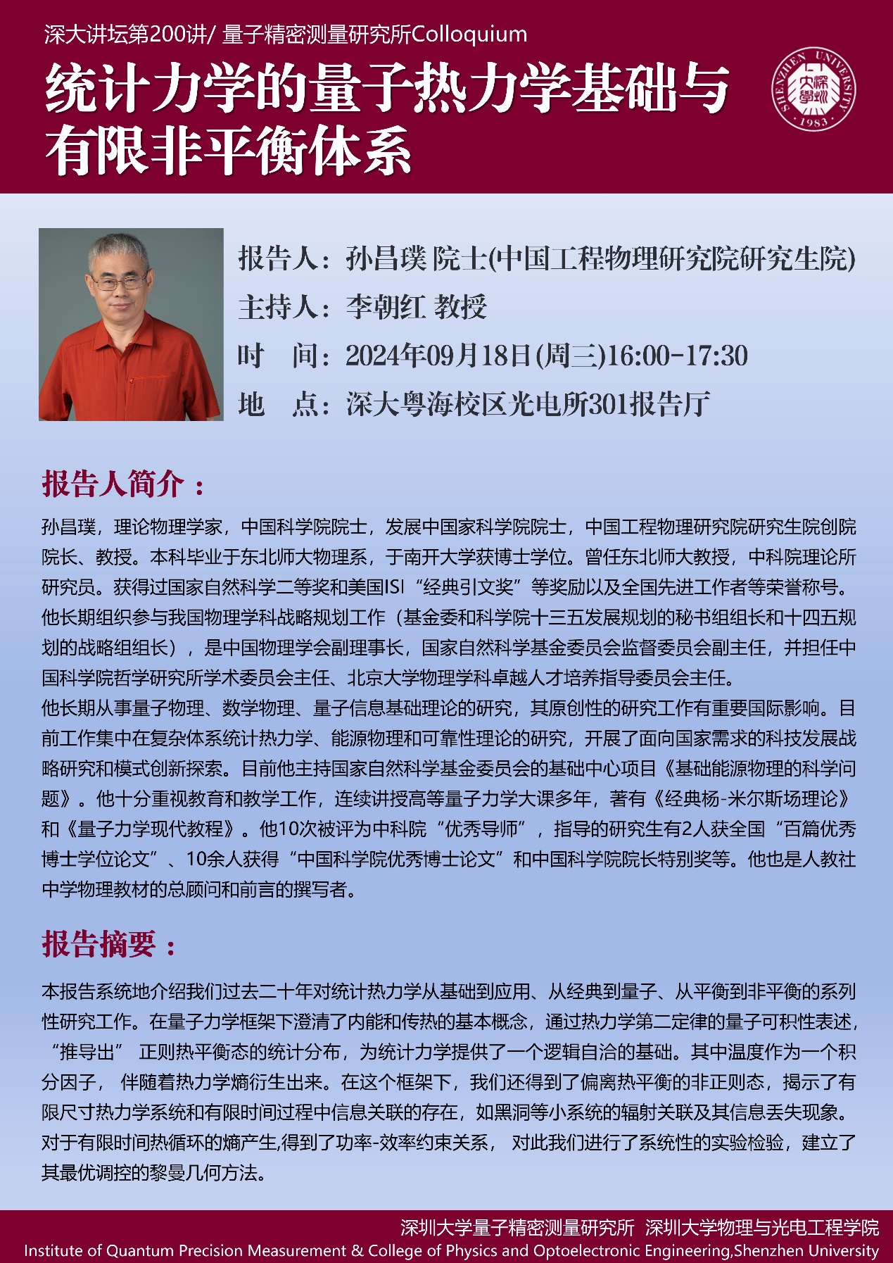 报告题目:统计力学的量子热力学基础与有限非平衡体系