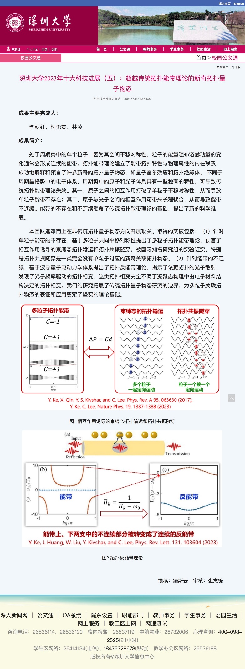 本团队迎难而上在非传统拓扑量子物态方向开展攻关。取得的突破包括:(1)针对单粒子能带的不存在,基于多粒子共同平移对称性提出了多粒子拓扑能带理论,预言了相互作用诱导的束缚态拓扑输运和拓扑共振隧穿,被国际知名研究组的实验证实,特别是拓扑共振隧穿是一类完全没有单粒子对应的新奇关联拓扑物态。(2)针对能带的不连续,基于波导量子电动力学体系提出了拓扑反能带理论,揭示了依赖拓扑的光子散射,发现了光子频率驱动的拓扑相变,这类拓扑相变完全不同于凝聚态物理中由电子材料结构决定的拓扑相变。我们的研究拓展了传统拓扑量子物态研究的边界,为多粒子关联拓扑物态的表征和应用奠定了坚实的理论基础。