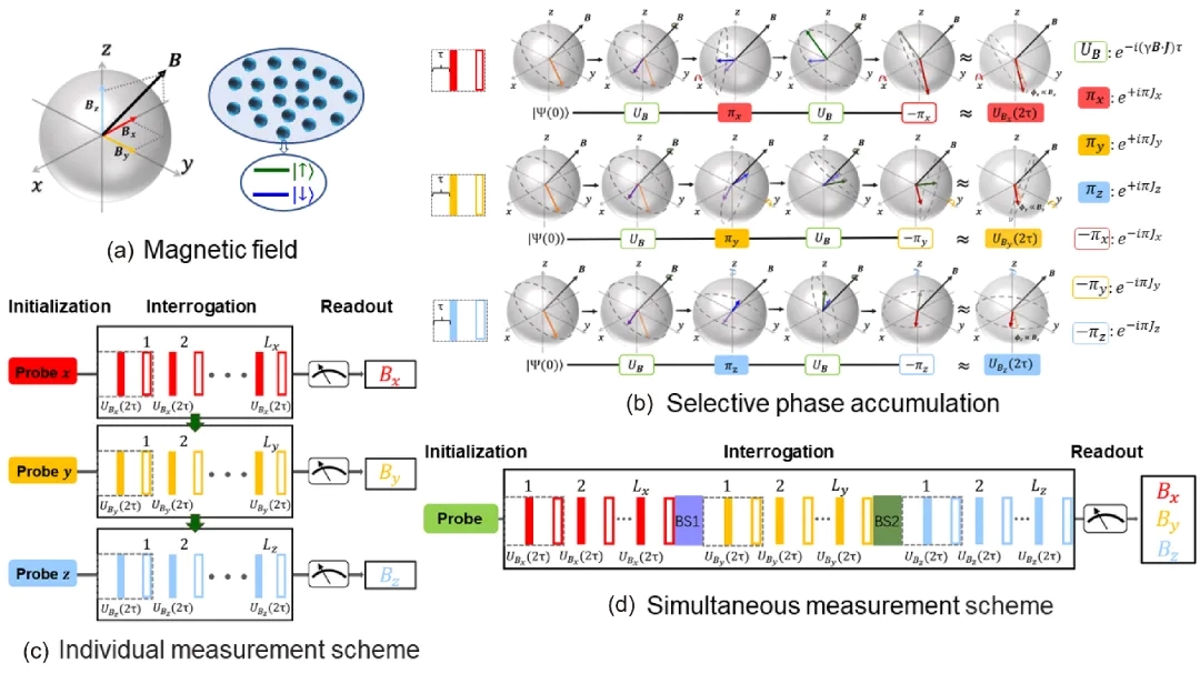 磁场是表征物质基本特性的重要物理量之一,其灵敏探测对基础科学研究和精密传感技术的发展至关重要。一般来说,磁场是一个矢量场,矢量磁场的高精度测量是一个重要研究课题。特别地,矢量直流磁场的高精度测量在磁导航、磁异常检测、生物医学成像等领域有着广泛的应用。然而,传统的矢量磁力计通常需要将传感器沿着不同的方向排列,分别测量不同方向的磁场分量。最近,一些研究表明可以利用最优控制方案来实现矢量磁场的高精度测量,但是难以应用到多体量子系统中。因此,如何在多体系统中实现矢量直流磁场的高精度测量非常具有挑战性。