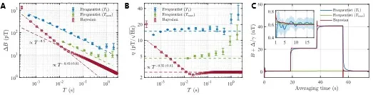 图2 贝叶斯冷原子磁力计的性能。(A) 不确定度与总探测时间的标度;(B) 灵敏度与总探测时间的标度;(C)频次测量与贝叶斯测量跟随阶梯变化磁场的追踪图。