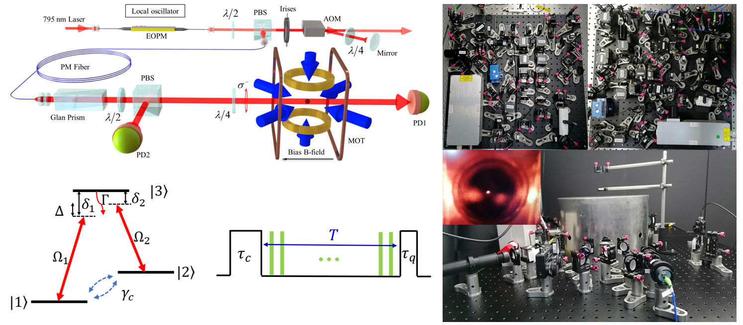 (1)冷原子多脉冲CPT-Ramey干涉。基于lin||lin构型下的相干布居数囚禁和冷铷-87原子系综,实验实现了时域多脉冲CPT-Ramey干涉,在两CPT脉冲间插入CPT脉冲序列,能有效抑制-Ramsey光谱的边带条纹、提高对中心条纹的识别度和对比度,并将时域多脉冲CPT-Ramsey干涉映射到空间F-P干涉,和实验结果相符[1]。从理论上分析了具有时间依赖失谐量的任意脉冲序列下的多脉冲CPT干涉,得到了普适的解析公式,分析了多种常用的CPT-Ramsey干涉测量方案,例如双脉冲对称和反对称光谱以及多脉冲对称和反对称光谱等[2]。全面阐述了基于冷原子CPT-Ramsey干涉的测量,包括常规和多脉冲技术,并探讨了其在实际量子传感器件中的潜在应[3]。通过反对称CPT-Ramsey光谱和组合脉冲,同时补偿由光频移诱导的相位和锁定冷原子CPT钟的频率,抑制了探测光频移,提高了原子钟的长期稳定度[4]。