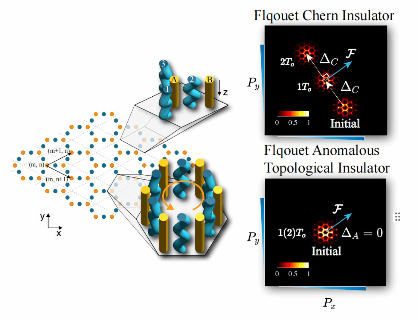 本工作针对这两种Floquet拓扑绝缘体因共同具有手性边缘态且远离平衡态而难以区分的问题,提出了一种基于二维布洛赫振荡的诊断方案。研究背景显示,Floquet拓扑绝缘体作为远离平衡态的拓扑能隙系统,在光子晶格中展现出丰富的物理特性,其中FCI和FATI分别以非零陈数和零陈数但非零能隙缠绕数为特征,传统方法无法通过手性边缘态直接区分二者。