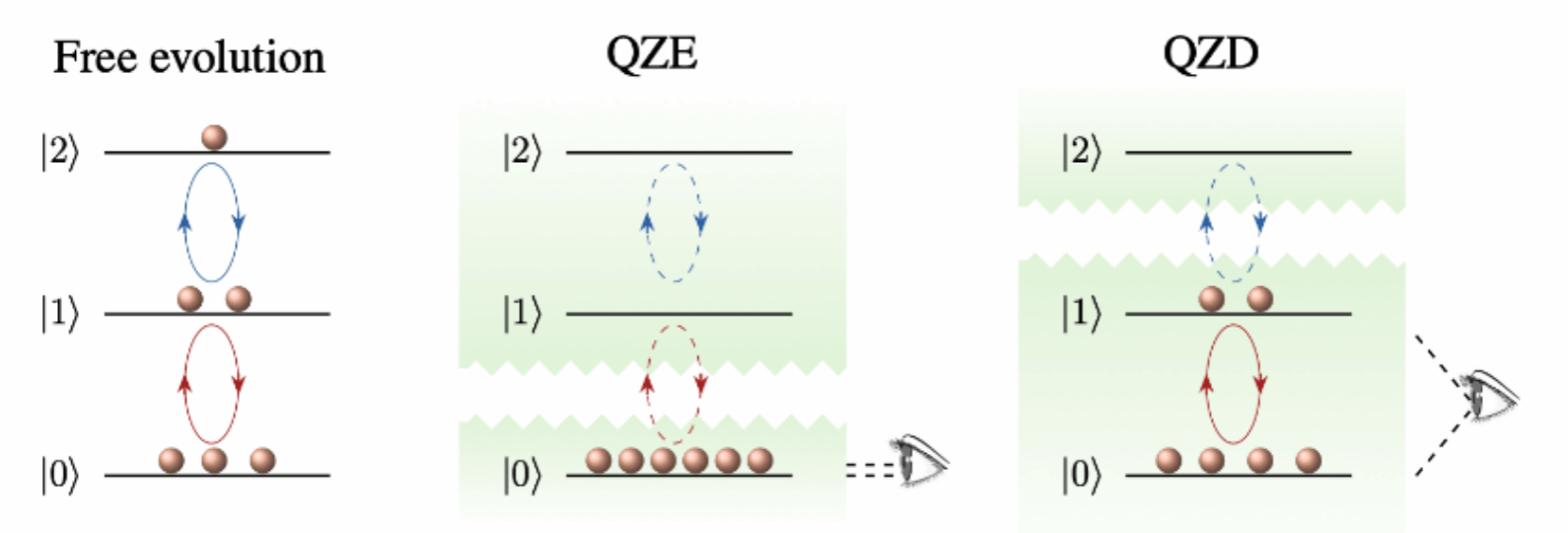 图. 从左到右依次为量子系统的自由演化,量子芝诺效应和量子芝诺动力学的示意图。